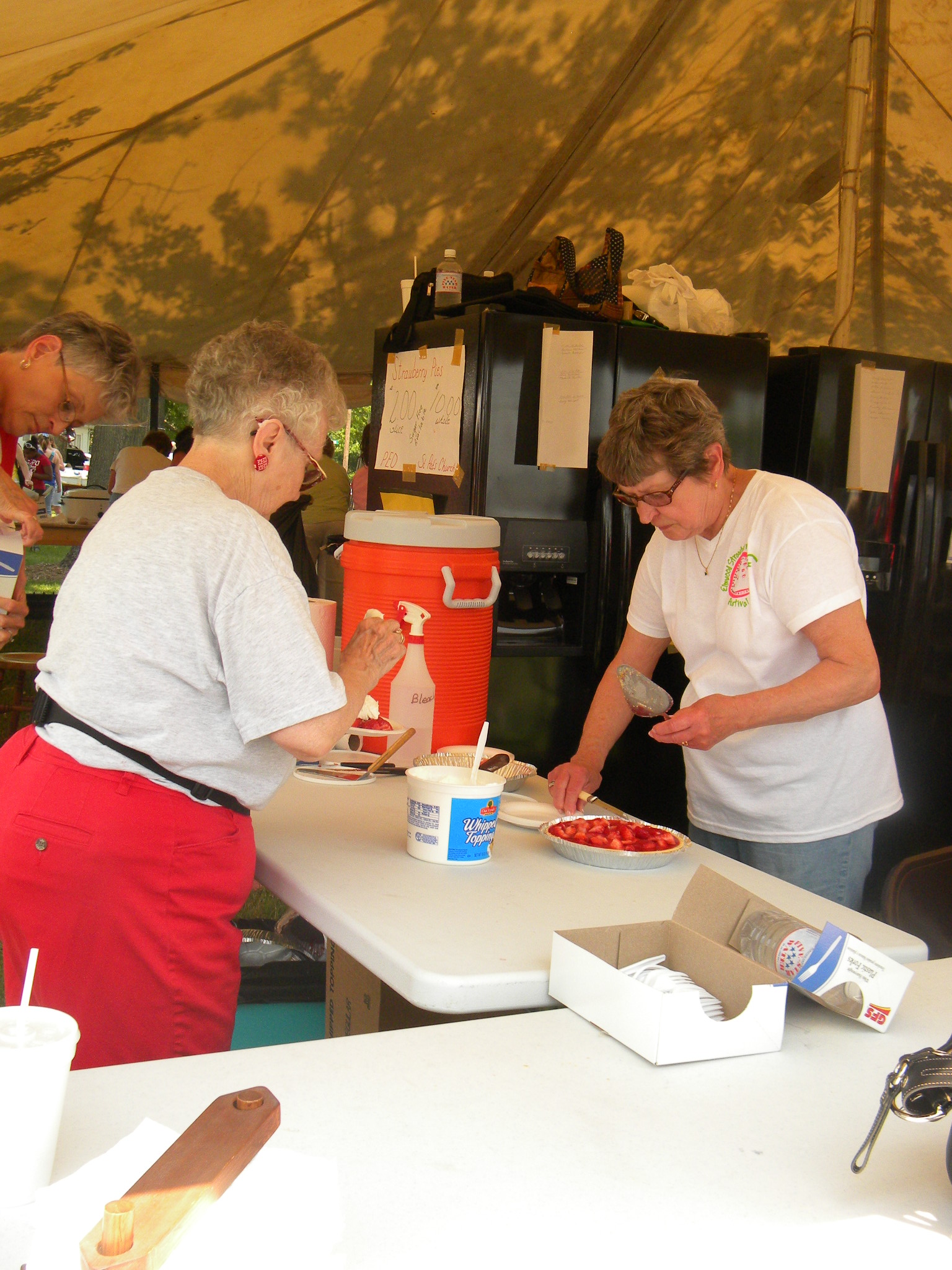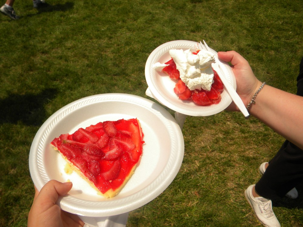 Aren’t those hilarious?On our way, we passed a bags tournament, a hula hooping contest and a live band! Once we got to the dessert/food tent, we bought some desserts from some little old ladies at the one and only food tent at the fair. I got strawberry pizza and Lindsey got a piece of strawberry pie. (She later went back to buy a whole pie to take home!)