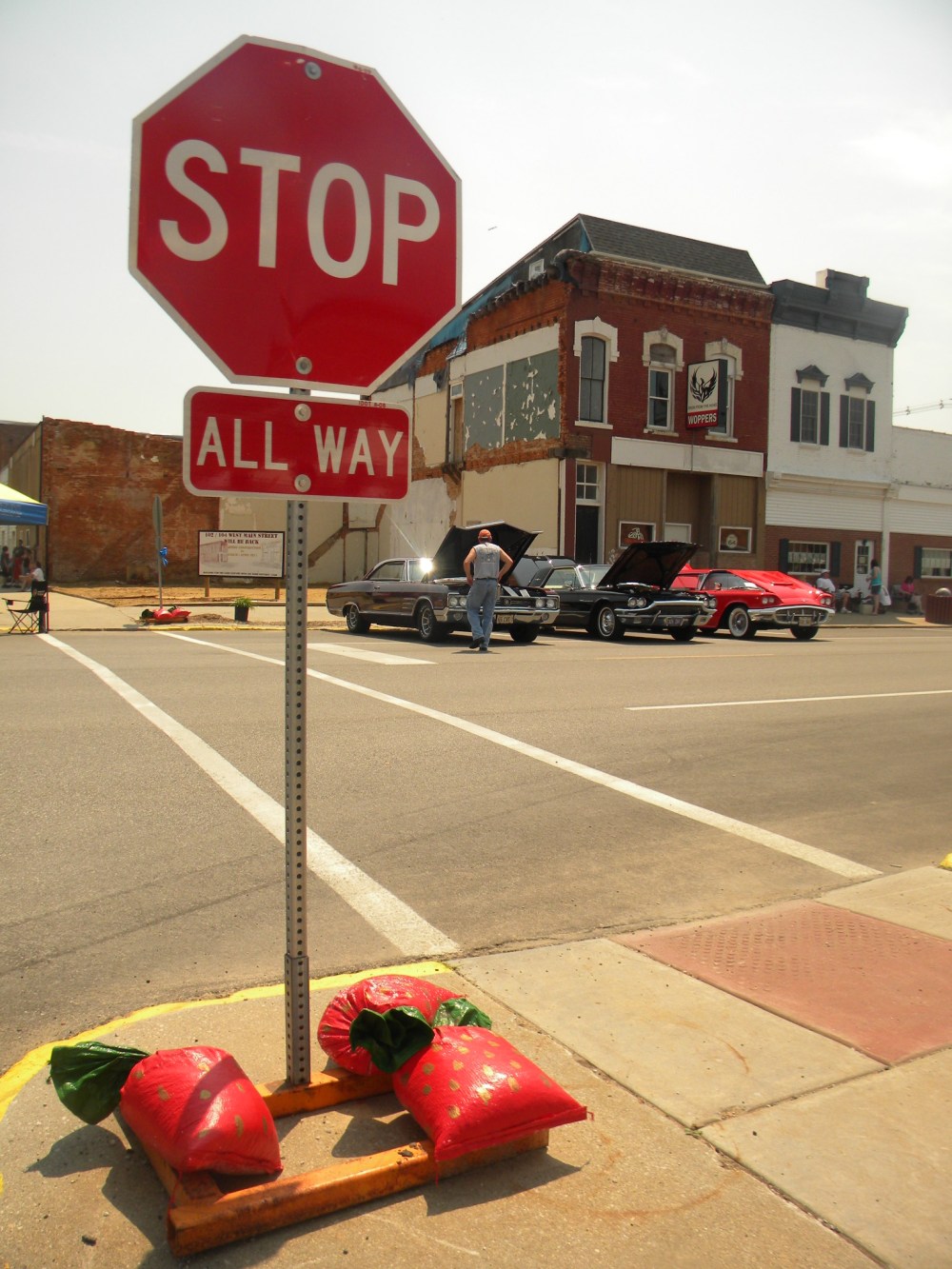 This car looked like it was eating Lindsey–so I added eyes and teeth for a dramatic effect. Once we were bored with the cars, we need to cool off with a sweet strawberry treat (sans alcohol–the Elmwood Strawberry Festival didn’t have a beer tent in sight!). As we headed to the food tent, we noticed these awesome sandbags: