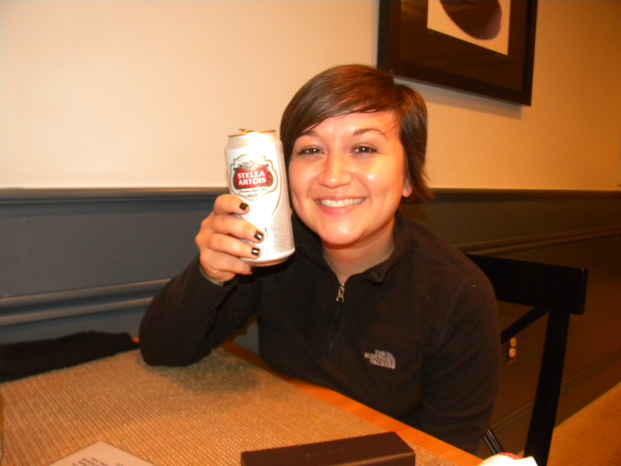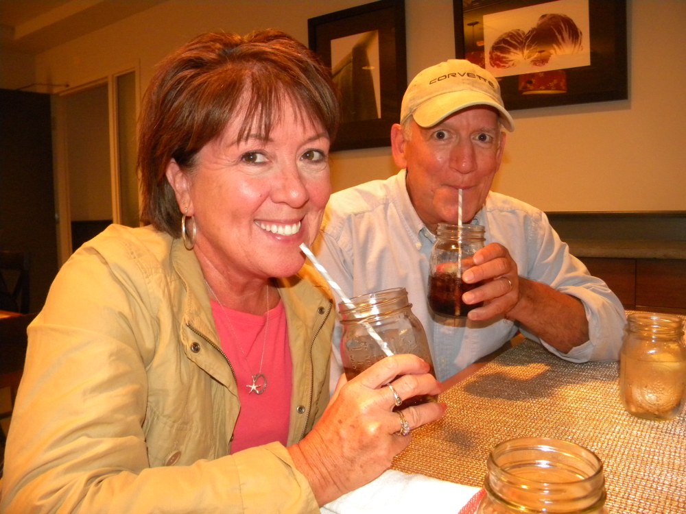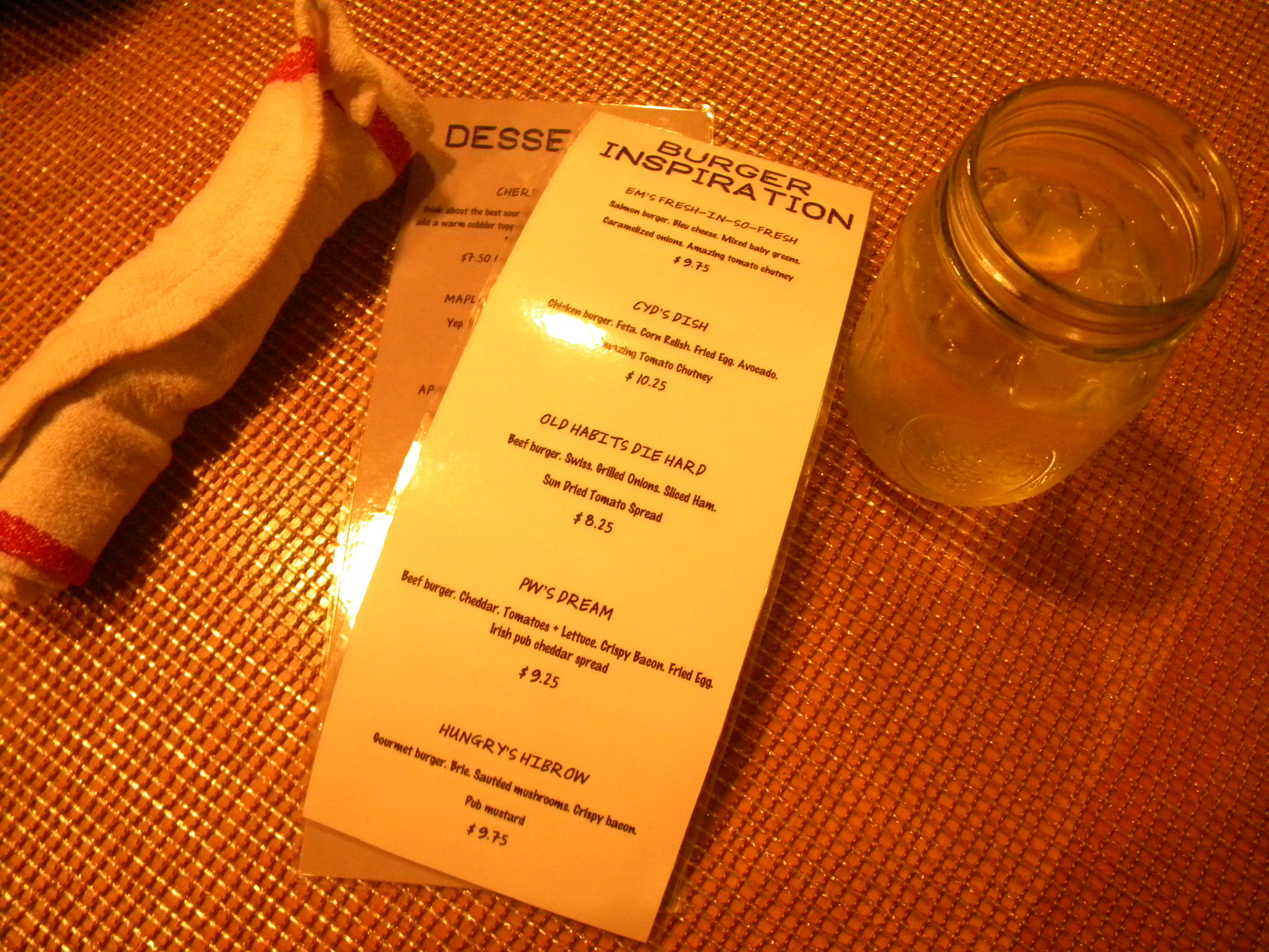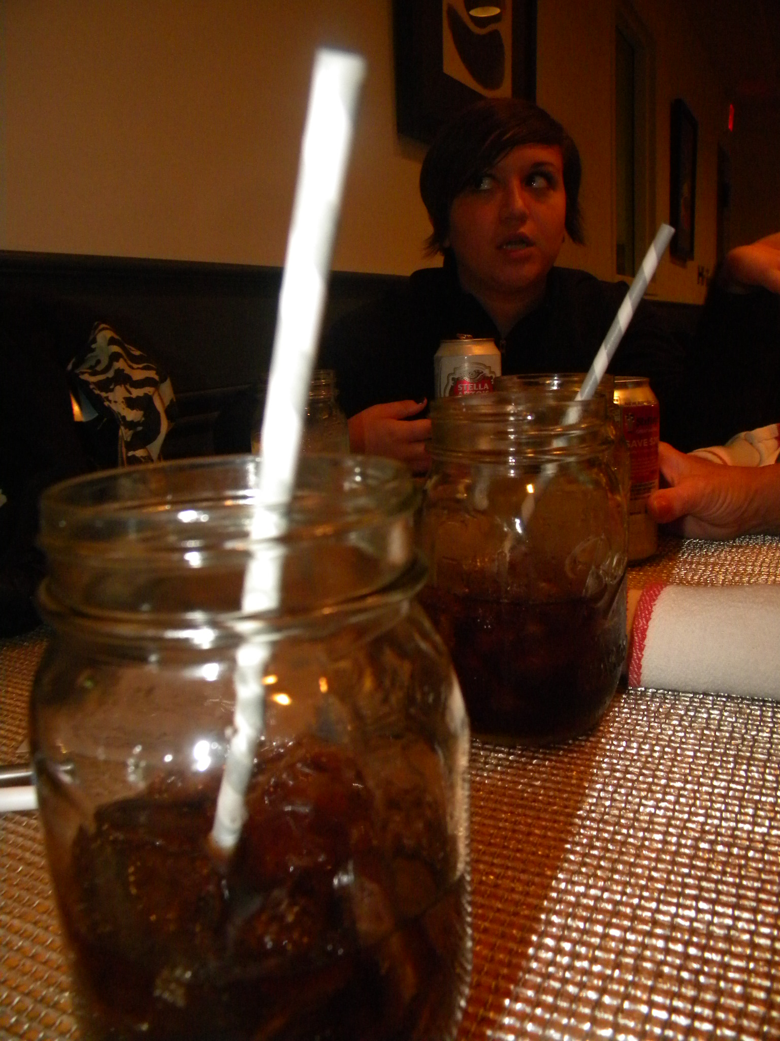 Lucky us, they opened the back “banquet room” which offered more seating…so we headed back and picked our own table. After a few minutes of waiting, we ordered our drinks… water is served in cute little mason jars…and my parents soda’s came out in mason jars too–but with really fun gray and white striped straws. I was a total bad ass and ordered Stella Artios–in a can…classy.