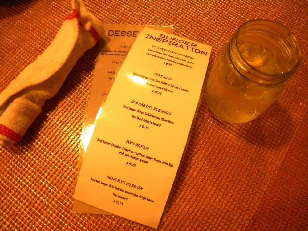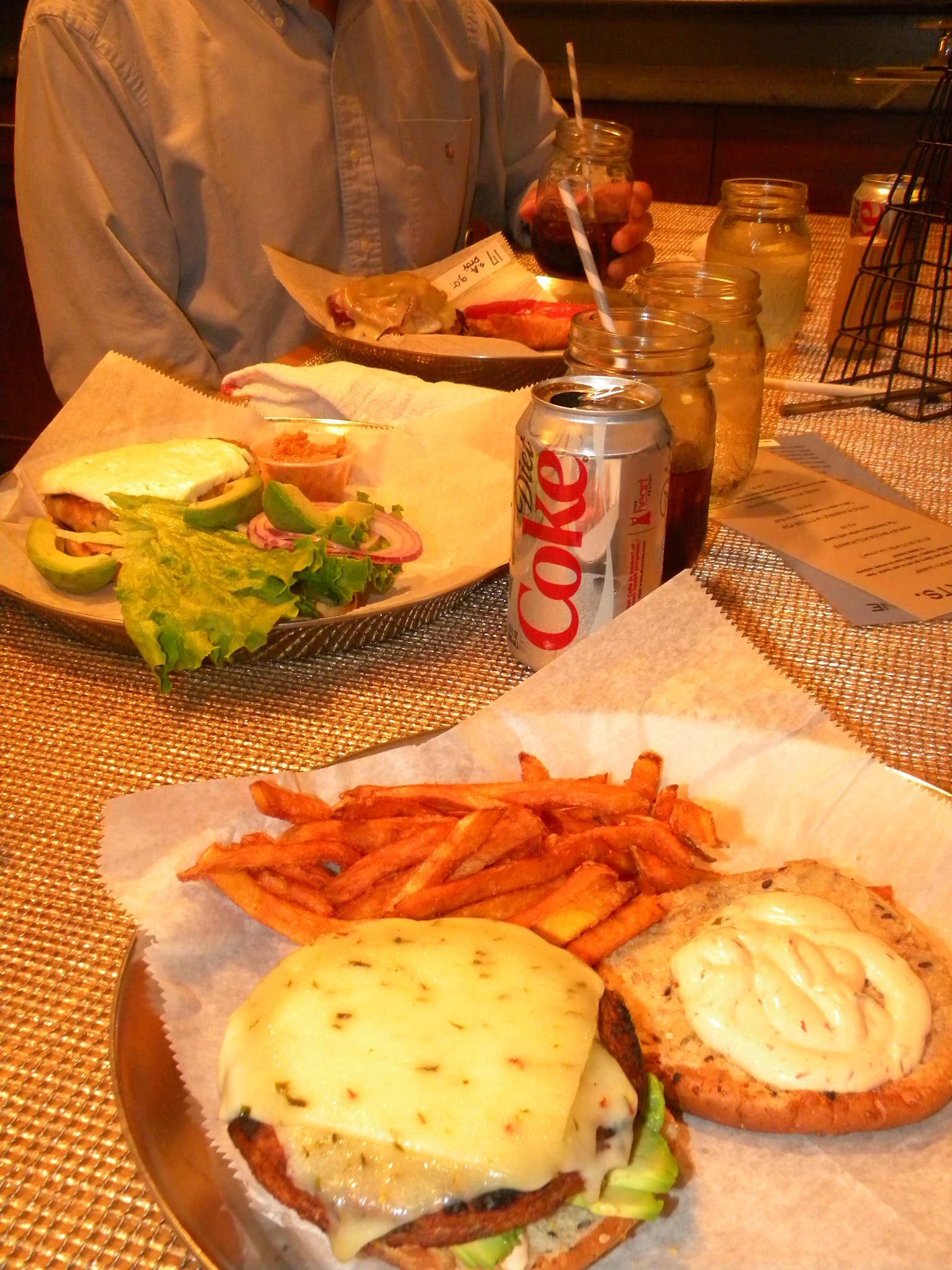 And then we browsed the burger inspiration sheet and marked our selections.. I ordered the veggie burger with pepperjack cheese, avocado and chipotle mayo, my mom got the chicken burger (which is ground up chicken with parmesan) with feta, avocado, onion, lettuce and sun dried tomatoes, and my dad got the secret agent (which is beef ground up with bacon–this summer’s special) with onion, provolone, tomatoes and mayo…and we all split some sweet potato fries.