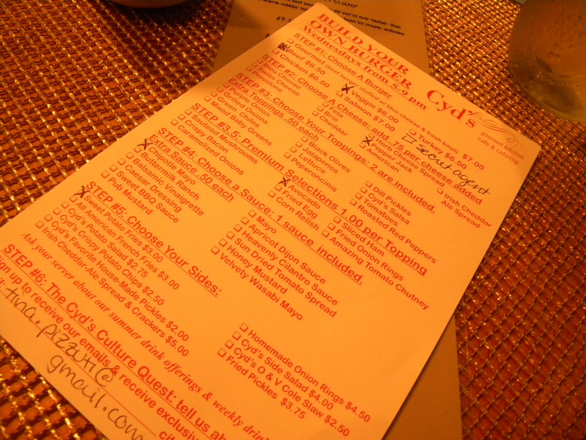 Who is the worst/laziest blogger? ME! I AM! I picked things back up last night by heading to Cyd’s for Burgers on the Boardwalk. Cyd’s is a local gourmet cafe–a definite favorite in my office–and they offer a build-your-own burger “special” every Wednesday night from 5 to 9pm.  Since I’ve been mooching off my parents any time I write about food for this blog, I decided it was time for me to give back–I took Mike and Linda out to dinner at Cyd’s for burgers! Favorite Daughter Badge.